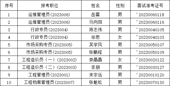 根據(jù)《亳州魏武國(guó)有資本投資控股集團(tuán)有限公司2023年工作人員公開(kāi)招聘》精神,經(jīng)筆試、面試、體檢、考察等環(huán)節(jié),確定岳雷等10名同志符合本次招聘條件,擬錄用為亳州魏武國(guó)有資本投資控股集團(tuán)有限公司工作人員,現(xiàn)予公示。