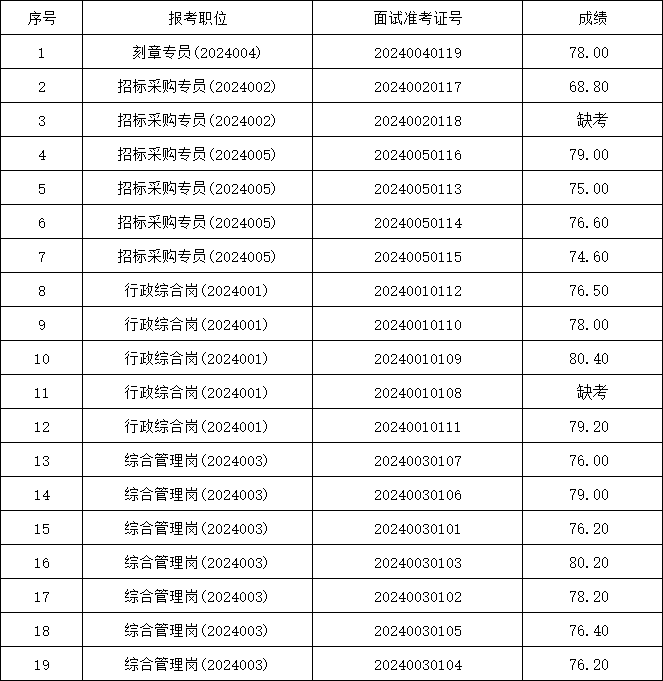 根據(jù)《關(guān)于2024年魏武國控集團(tuán)亳州市譙郡產(chǎn)業(yè)投資集團(tuán)有限公司外包人員公開招聘》有關(guān)規(guī)定,現(xiàn)將面試成績予以公示。