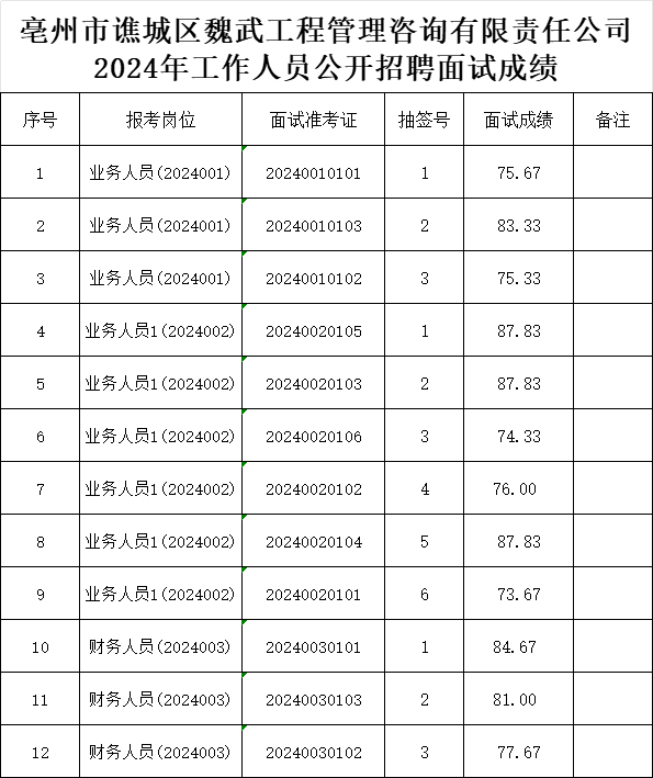 關(guān)于亳州市譙城區(qū)魏武工程管理咨詢有限責任公司2024年工作人員公開招聘面試成績及綜合成績的公示